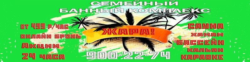 Банька семейная "Жара" Красное село Приглашаем в гости к Вашим услугам: Финская сауна Турецкая парная хамам Прозрачный бассейн с подсветкой Банкетный зал с караоке ТВ на большом экране Комната отдыха Веники березовые, дубовые, эвкалиптовые Травяные настои и чаи тел: 900-22-74 СООБЩАЕМ официальные телефоны и контакты: управляющий (бронирование времени): 8 (921) 900-22-74 администратор: 8 (931) 595-29-56 Карта сбербанка для внесения предоплаты: Официальная группа "Банька семейная "Жара" https://vk.com/zhara_sauna Официальный контакт "Банщик Вадим " https://vk.com/id343284126 Инстаграм: https://www.instagram.com/zhara_krasnoe_selo